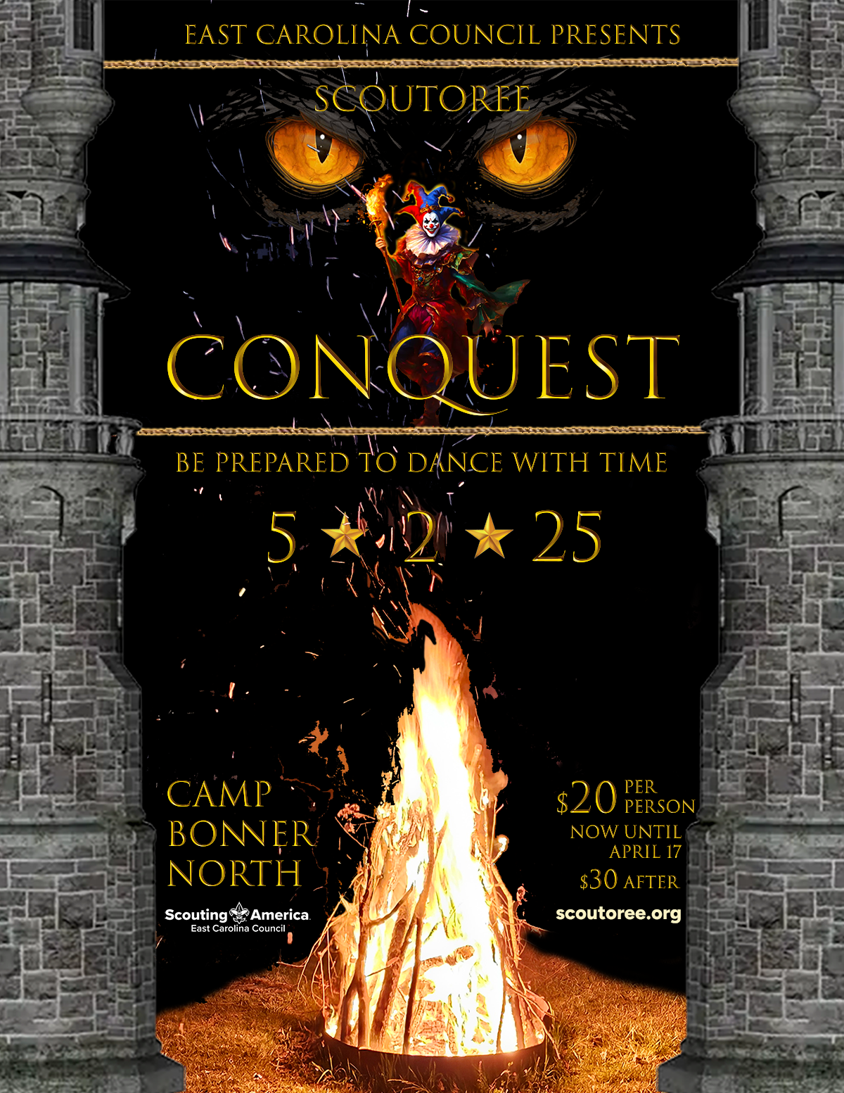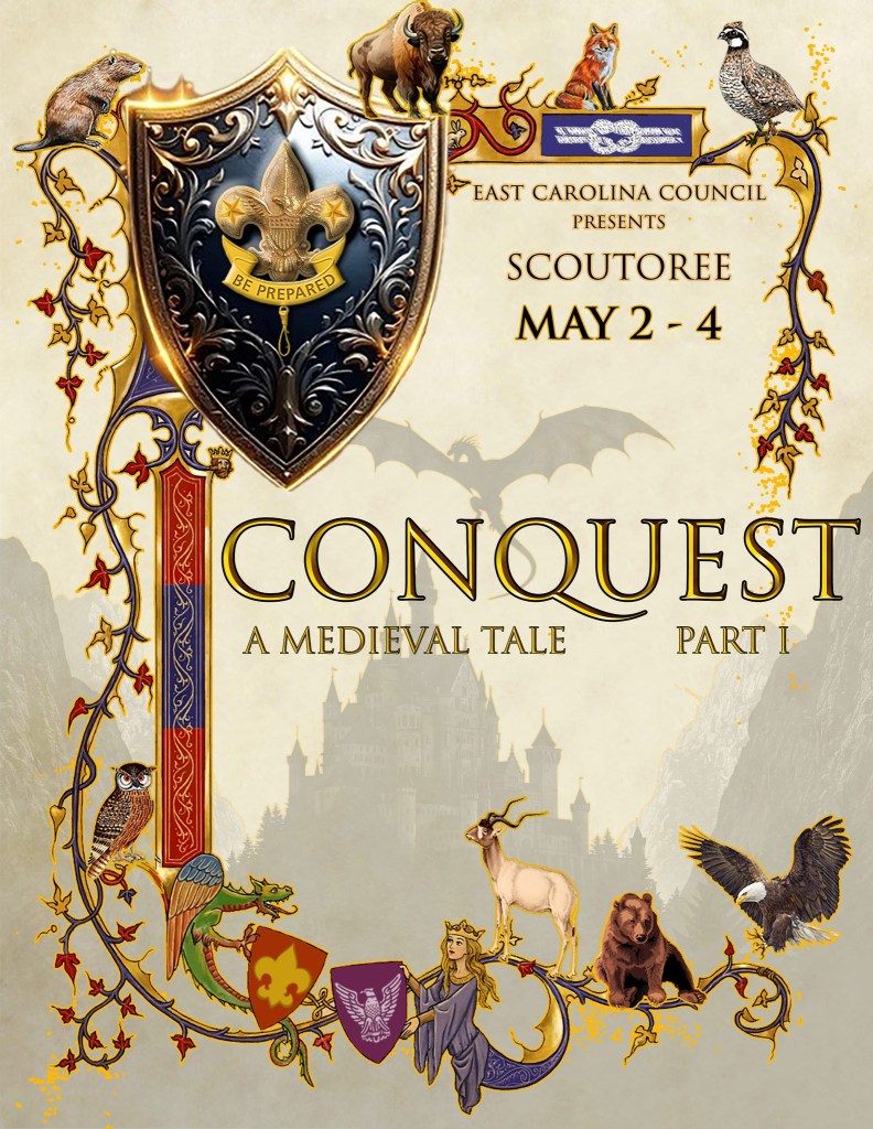 EAST CAROLINA COUNCIL presents A TIMELESS VALUES TRILOGY. In this epic three-year story, units jump into the year 1265 to explore the oldest values of Scouting. Scouts arrive in an unknown, medieval land as observers but are very quickly thrust into a game of conquest that will test their skills all while racing against the clock to return home. Surrounded by characters and customs only seen in the world of fantasy, our team of explorers will learn that the door to time and space doesn’t always close when it’s opened. Be prepared for unforeseen consequences. Where we’re going, we don’t need roads.