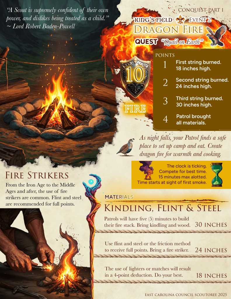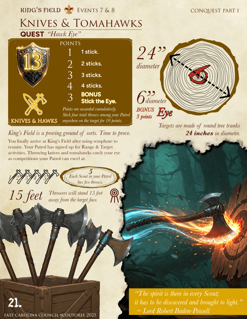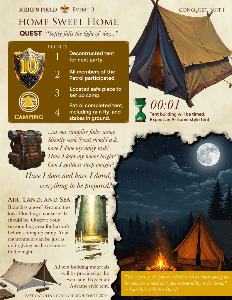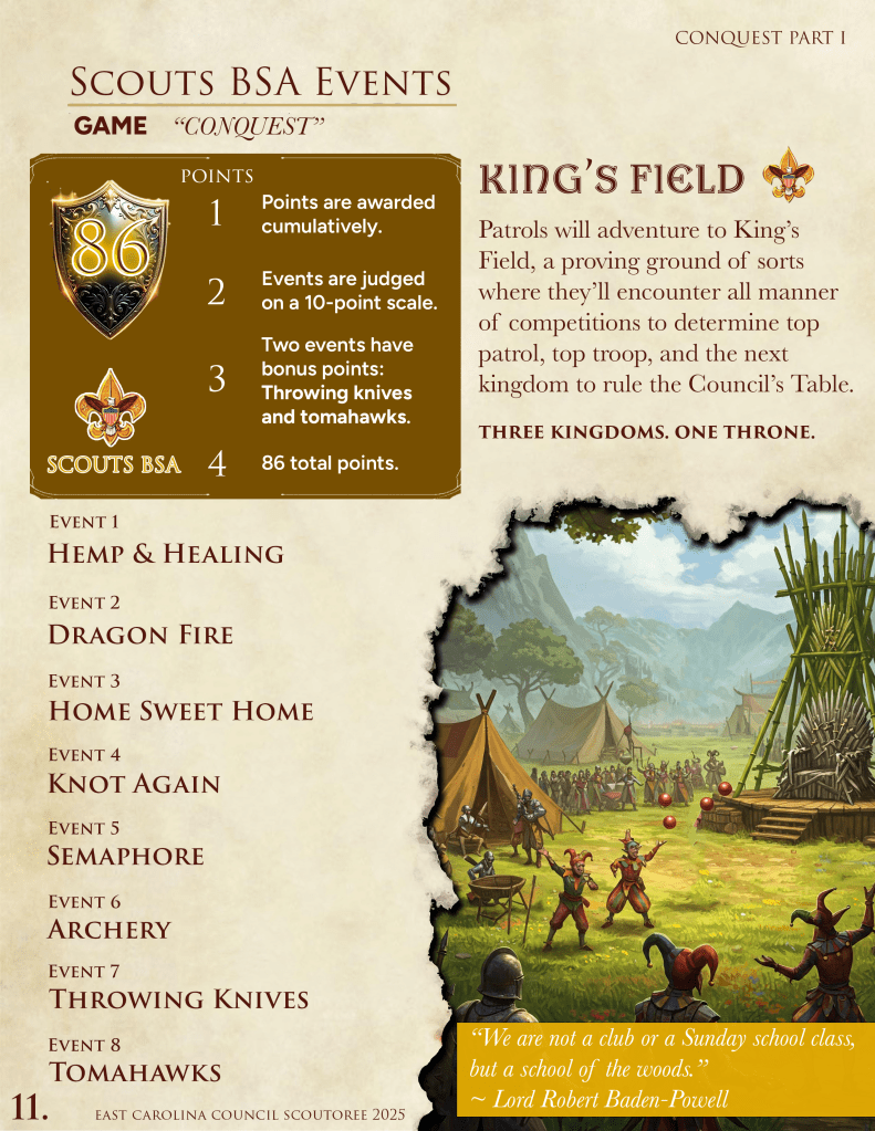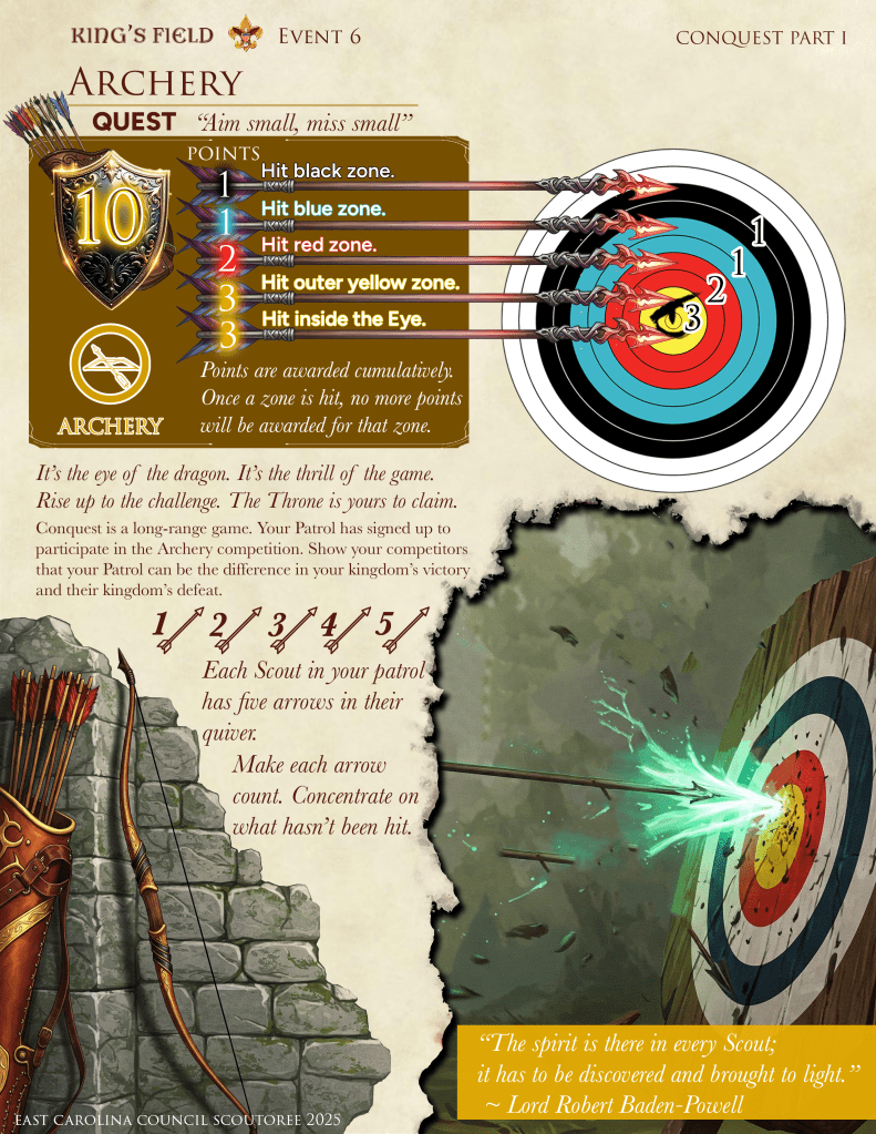 King’s Field is a proving ground for Scouts BSA Patrols. Prove your worthiness as the top patrol at CONQUEST SCOUTOREE. May fortune be ever in your favor.