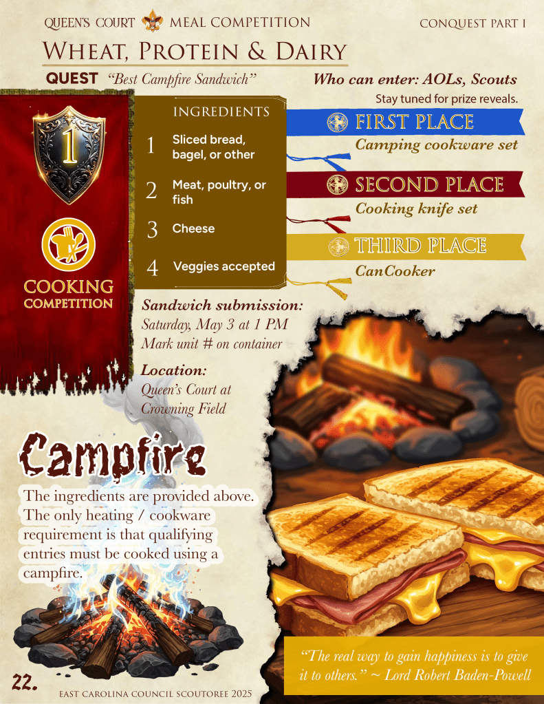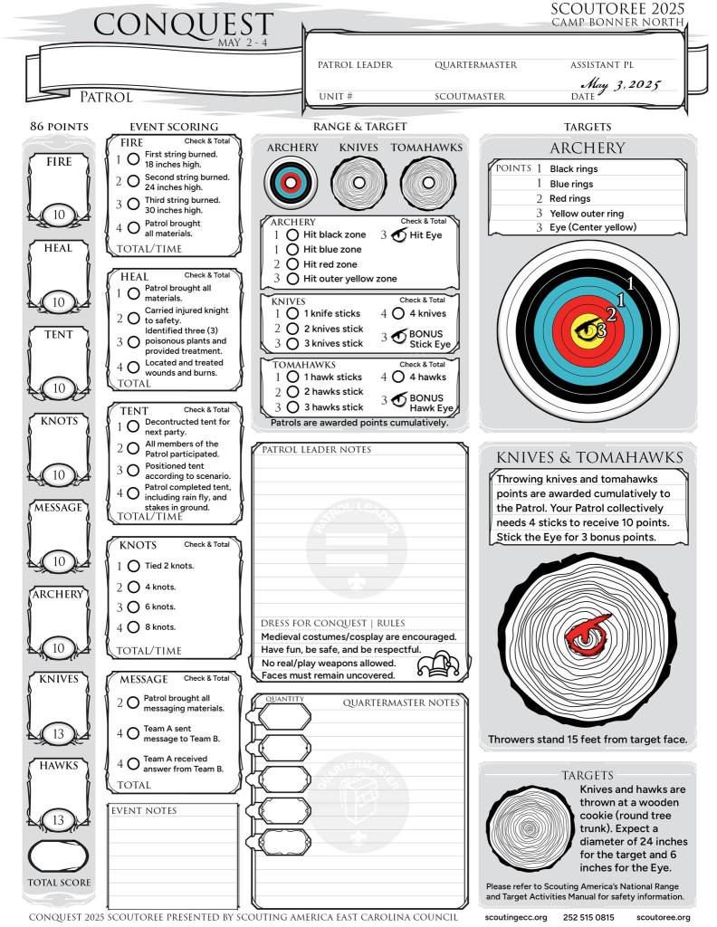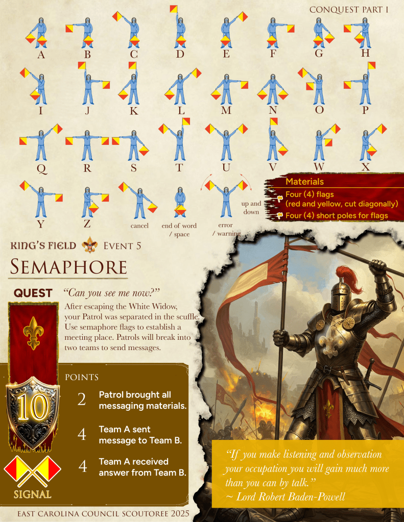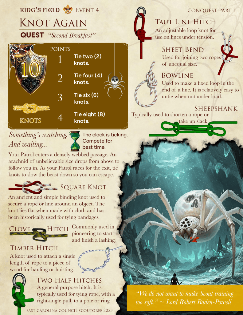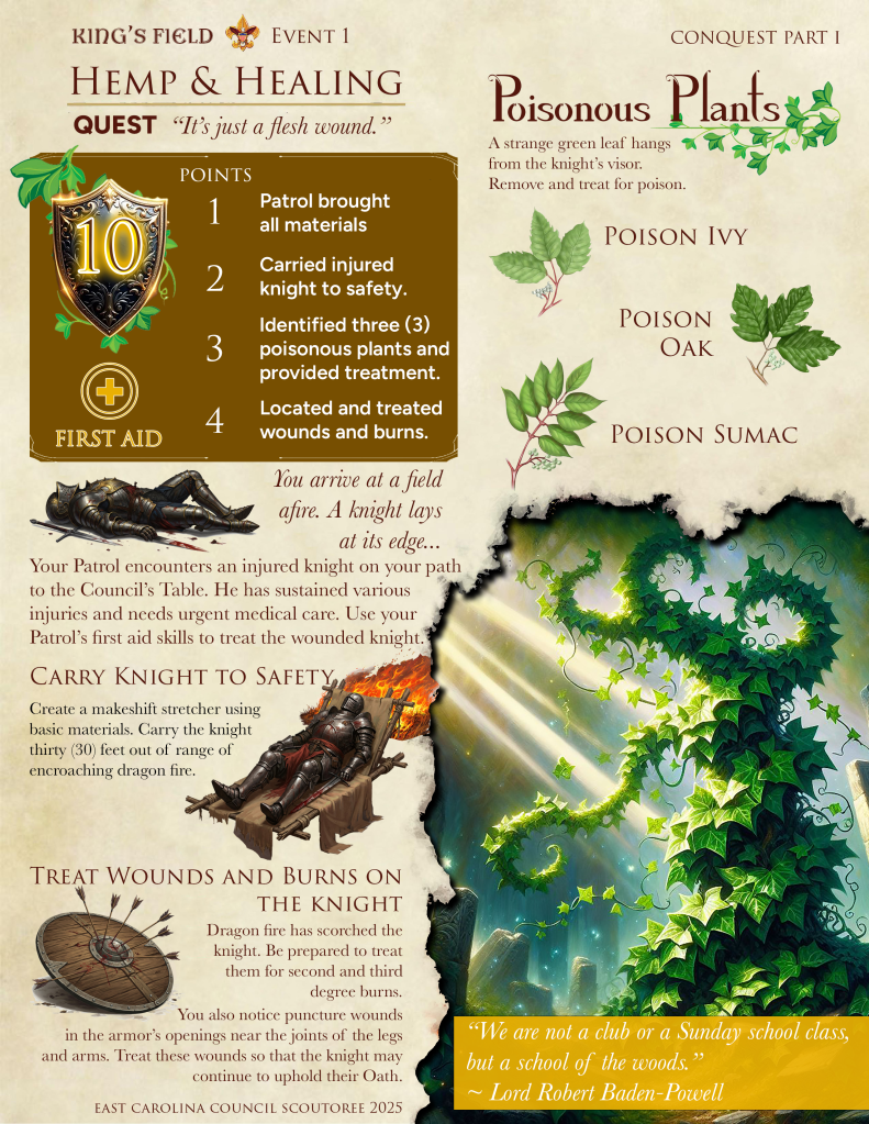 King’s Field is a proving ground for Scouts BSA Patrols. Prove your worthiness as the top patrol at CONQUEST SCOUTOREE. May fortune be ever in your favor.
